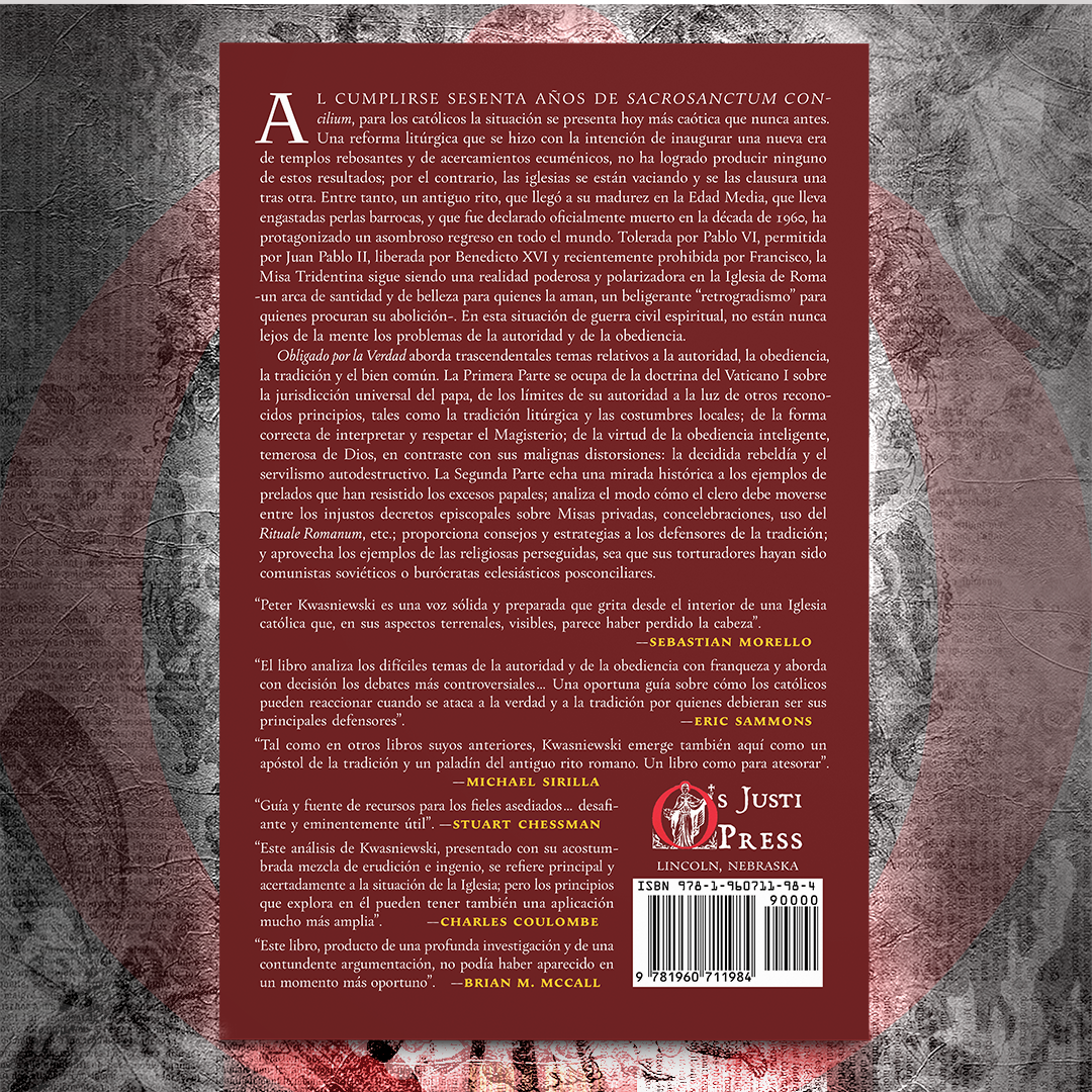 Obligado por la Verdad aborda trascendentales temas relativos a la autoridad, la obediencia, la tradición y el bien común ✝️📖. La Primera Parte se ocupa de la doctrina del Vaticano I sobre la jurisdicción universal del papa, de los límites de su autoridad a la luz de otros reconocidos principios, tales como la tradición litúrgica y las costumbres locales; de la forma correcta de interpretar y respetar el Magisterio; de la virtud de la obediencia inteligente, temerosa de Dios 🙏, en contraste con sus malignas distorsiones: la decidida rebeldía y el servilismo autodestructivo.